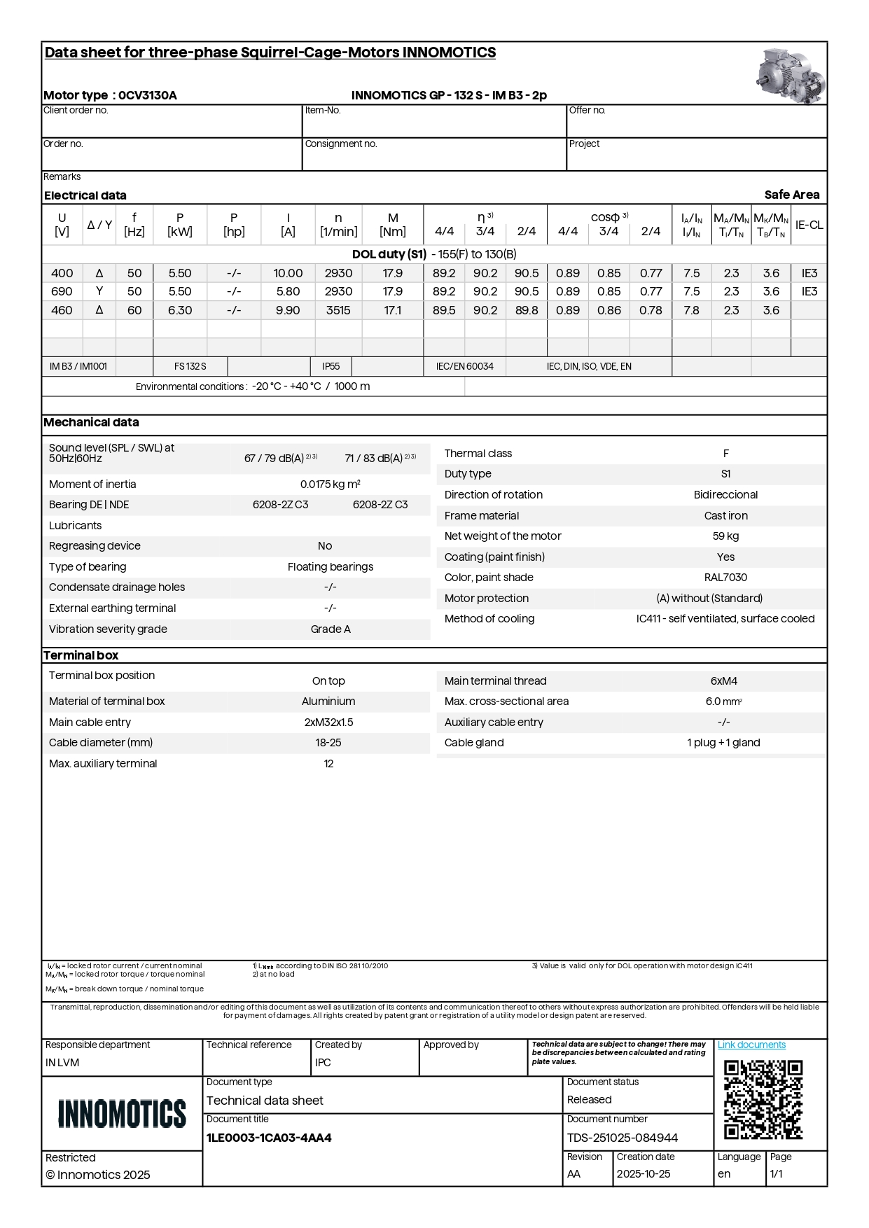 5.5KW, 2POLE, FS 132S, Class F, IP55, IMB3, IE3, ASL1000m, 400/690V, IC411