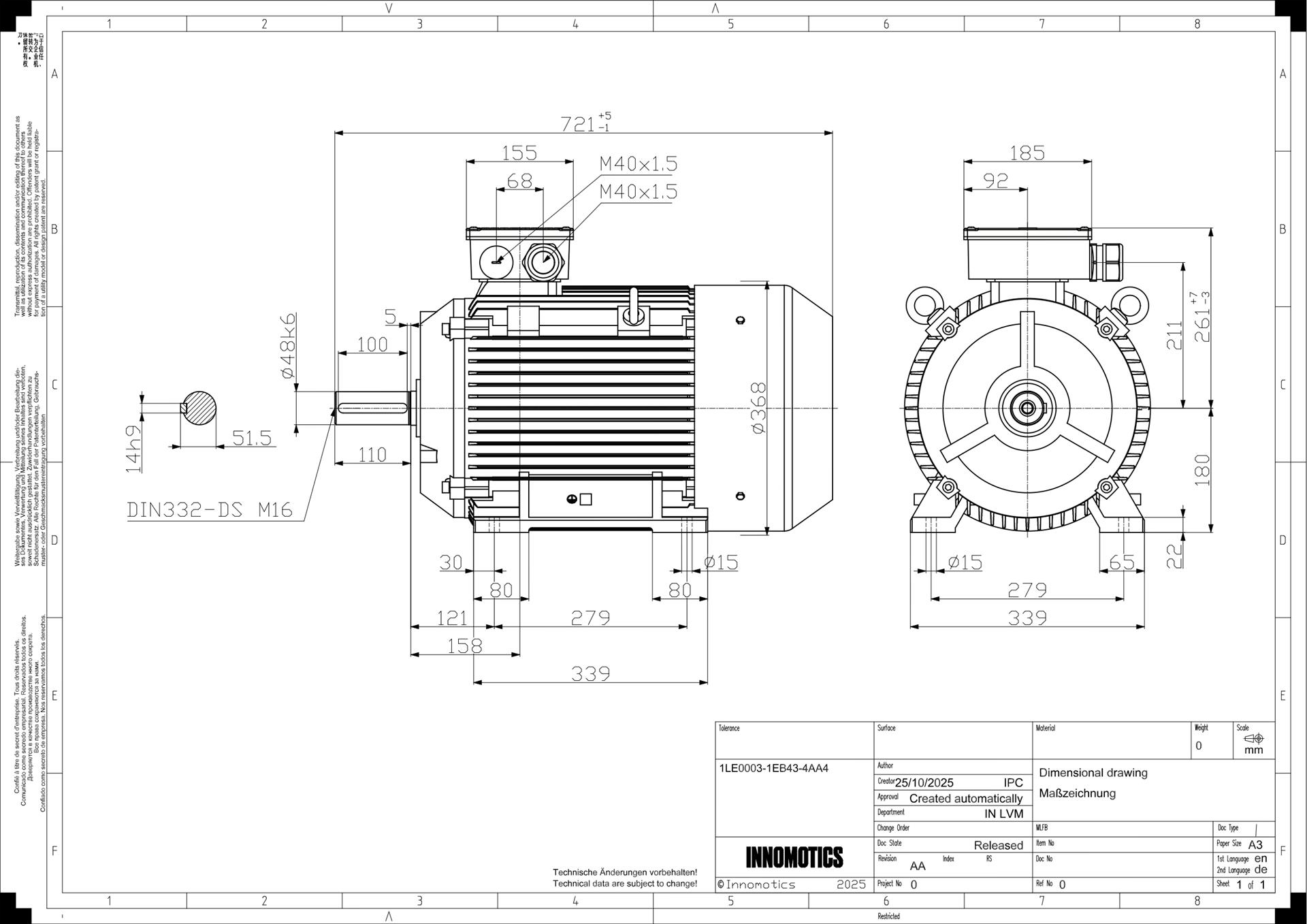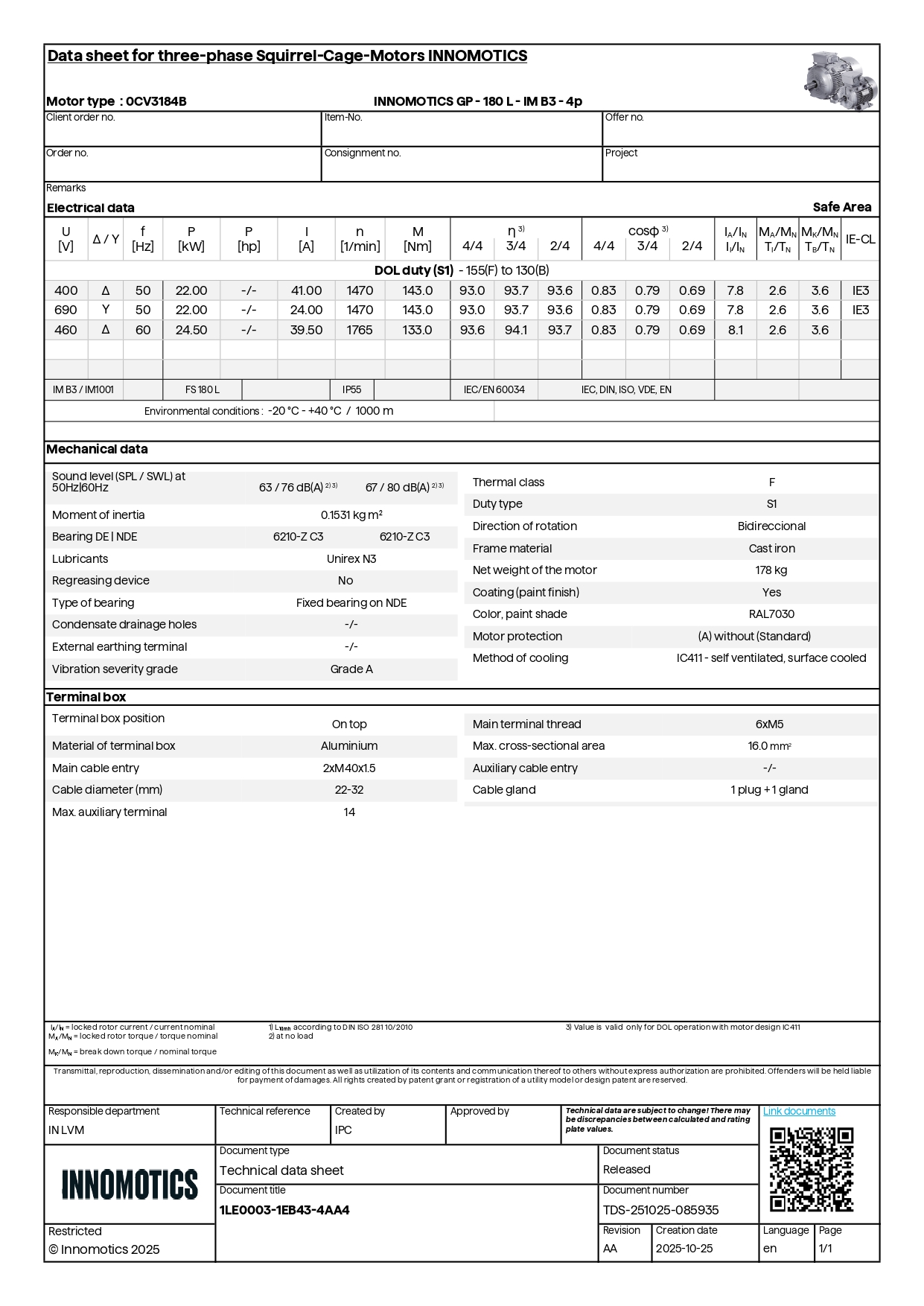 22KW, 4POLE, FS 180L, Class F, IP55, IMB3, IE3, ASL1000m, 400/690V, IC411