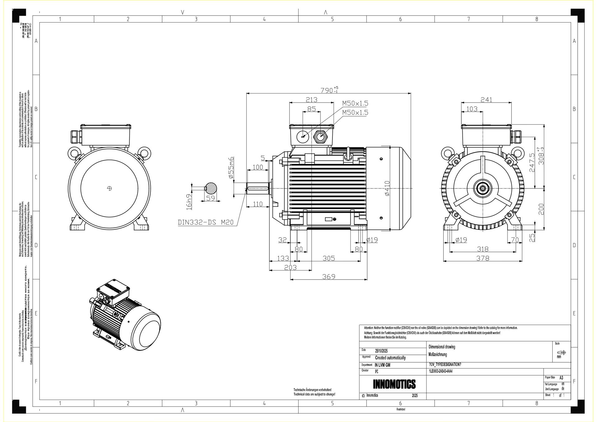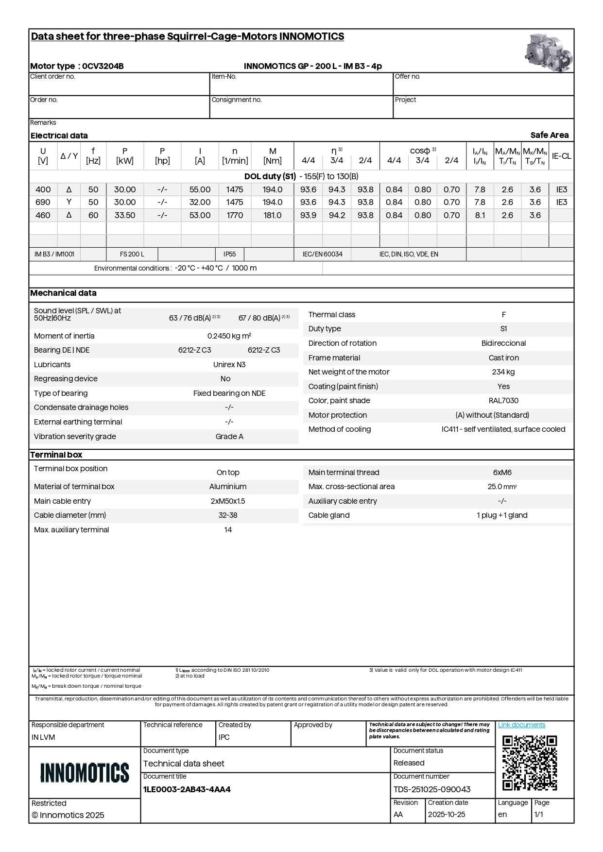 30KW, 4POLE, FS 200L, Class F, IP55, IMB3, IE3, ASL1000m, 400/690V, IC411